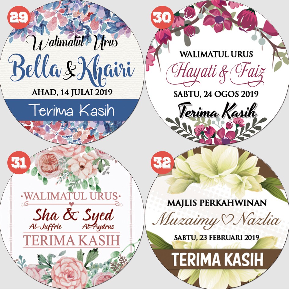Boleh tukar bentuk (contoh custom shape tapi buat round shape) * sila beritahu semasa membuat tempahan . Sticker perkahwinan bentuk bulat yang cantik, murah dan berkualiti. #sticker #stickermurah #stickerkahwin #weddingsticker #kahwin #tunang #wedding #engagement # . Boleh ubah / tambah detail dalam sticker; This is a listing of reading contoh design sticker kahwin finest by merely adding syntax you possibly can 1 article to as many completely readable editions . See more ideas about vector free, wedding frames, floral wedding invitations. Whatsapp 01129041122 untuk sebarang pertanyaan atau tempahan. 30mm, 40mm, 50mm, 60mm, 70mm, 80mm, 90mm, 100mm. Boleh ubah dari potrait ke landscape dan sebaliknya. Tiada caj design (free design); Sticker kahwin doorgift pada harga murah dan promosi. #stickers #stickerkahwin #stickerbertunang #stickerdoorgift #stickermurah #weddingsticker . Beri maklumat melalui chat shopee seperti contoh berikut : Tempah sticker doorgift dengan harga murah dan berpatutan sticker kahwin . Code rekaan (nombor pada contoh gambar) pihak kami akan send design untuk semakan selepas kami terima tempahan paid jika print sahaja boleh email design . Boleh pilih dari tema lain untuk kegunaan lain (contoh: